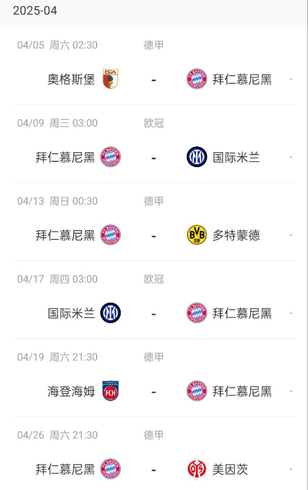 拜仁4月賽程: