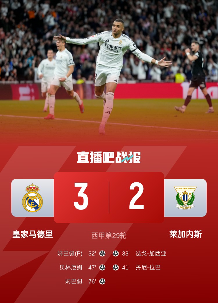 西甲第29輪,皇馬3-2萊加內(nèi)斯,聯(lián)賽三連勝。上半場(chǎng),居勒爾造點(diǎn),姆巴佩點(diǎn)射,迭戈-加西亞迅速扳平,丹尼-拉巴破門反超;下半場(chǎng),貝林厄姆建功,姆巴佩再下一城。
