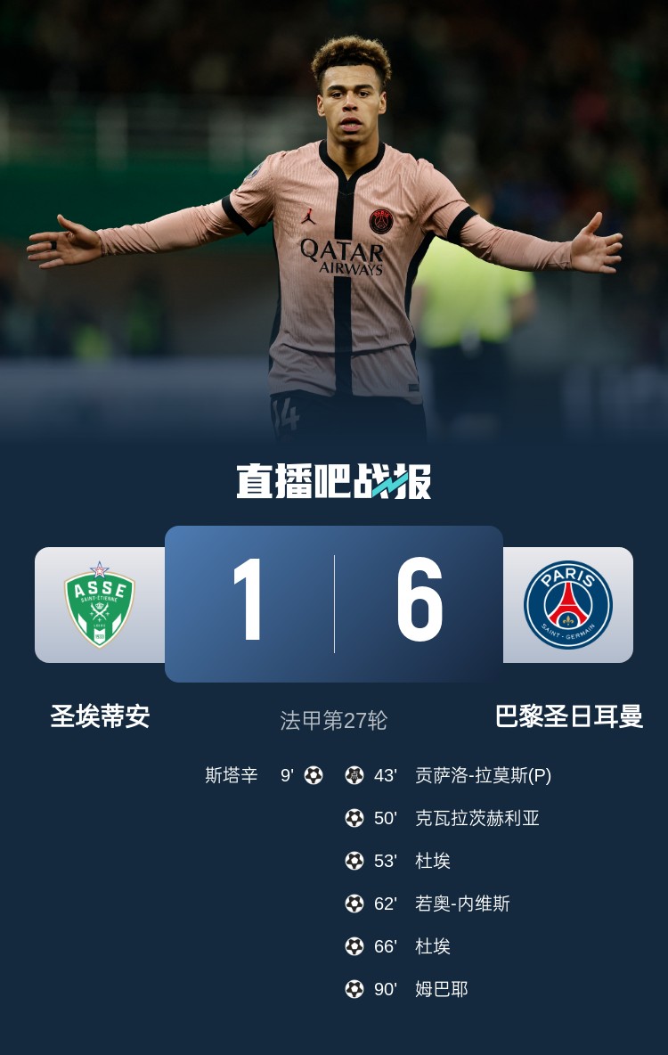 法甲第27輪,巴黎6-1大勝圣埃蒂安,暫以22分優(yōu)勢(shì)領(lǐng)跑。上半場(chǎng),斯塔辛首開紀(jì)錄,貢薩洛-拉莫斯點(diǎn)射扳平;下半場(chǎng),克瓦拉茨赫利亞擴(kuò)大比分,內(nèi)維斯破門,杜埃梅開二度,姆巴耶打進(jìn)一球。