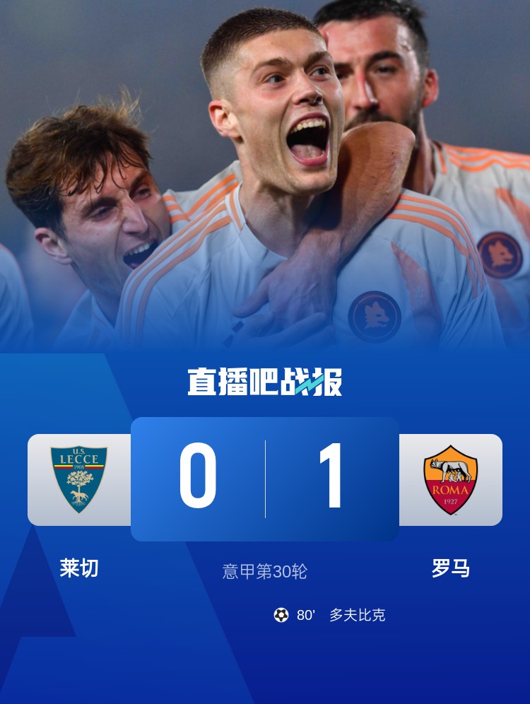 意甲第30輪,萊切0-1羅馬。上半場(chǎng),科內(nèi)錯(cuò)失良機(jī);下半場(chǎng),小曼奇尼進(jìn)球被吹,多夫比克低射制勝。