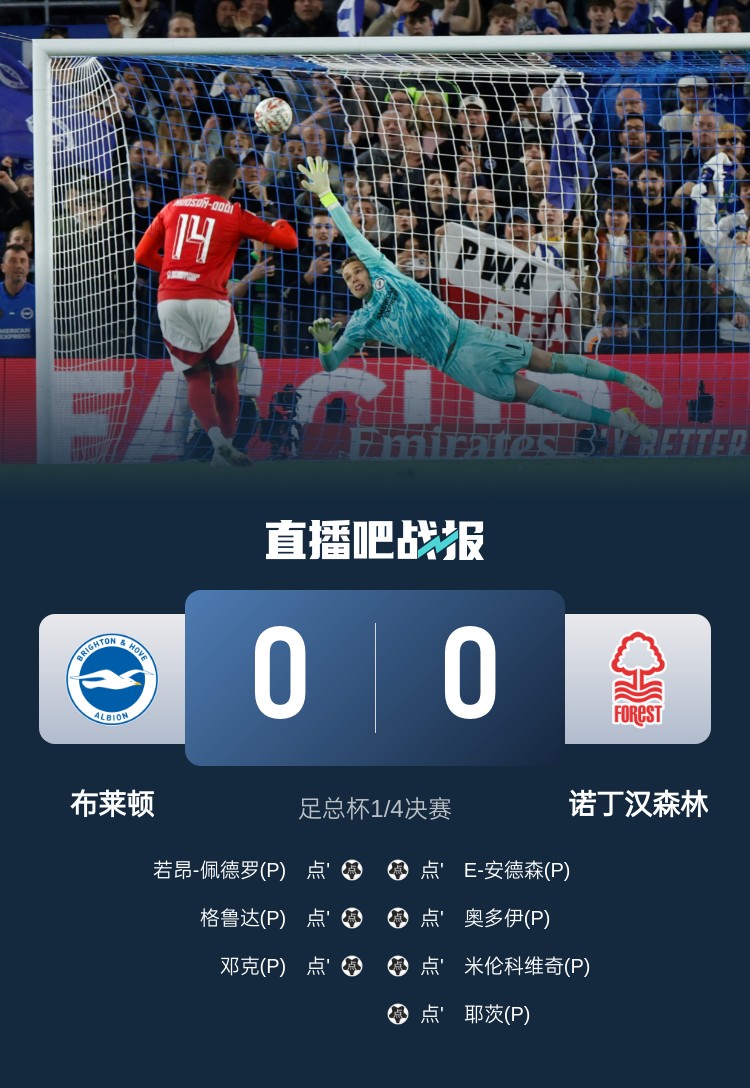 足總杯1/4決賽,布萊頓點(diǎn)球大戰(zhàn)3-4諾丁漢森林遭淘汰。上半場(chǎng),埃斯圖皮尼遠(yuǎn)射造險(xiǎn);下半場(chǎng),主裁判判罰三笘薰禁區(qū)內(nèi)犯規(guī)但VAR取消點(diǎn)球;加時(shí)賽,佩德羅破門但助攻的埃斯圖皮尼安越位;點(diǎn)球大戰(zhàn),辛謝爾伍德、戈麥斯主罰被撲出,威廉姆斯爆射打飛。