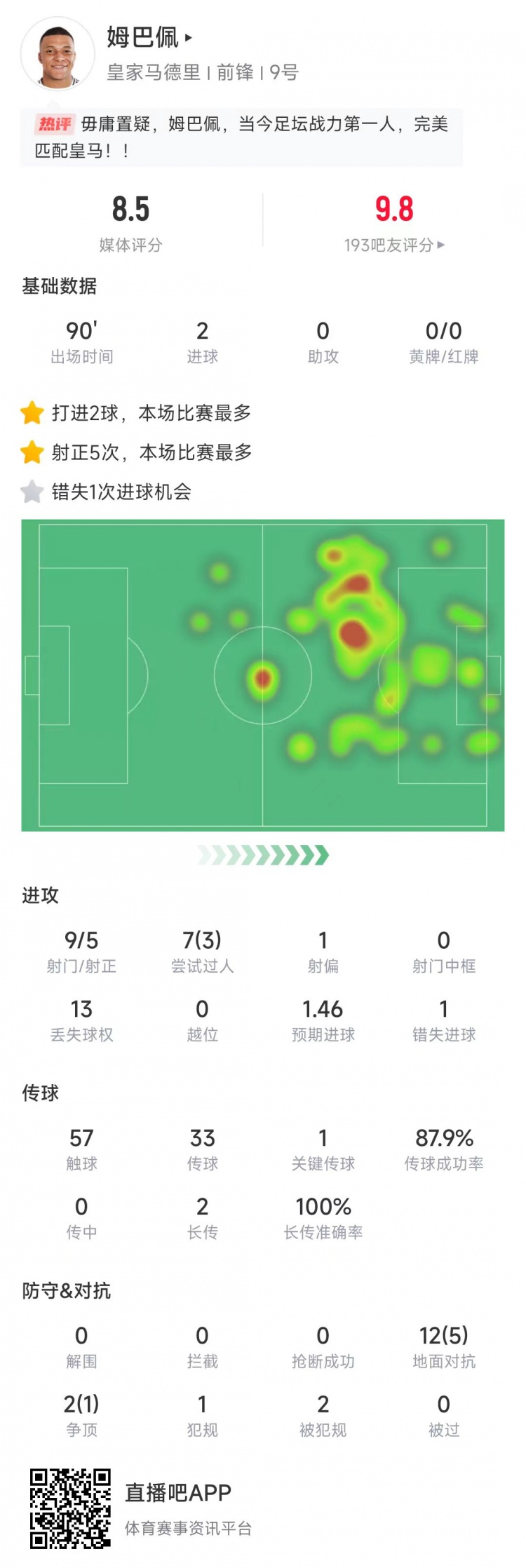 2025-03-30 20:24:30姆巴佩當(dāng)選全場最佳球員:9次射門打進2球,7次過人3次成功