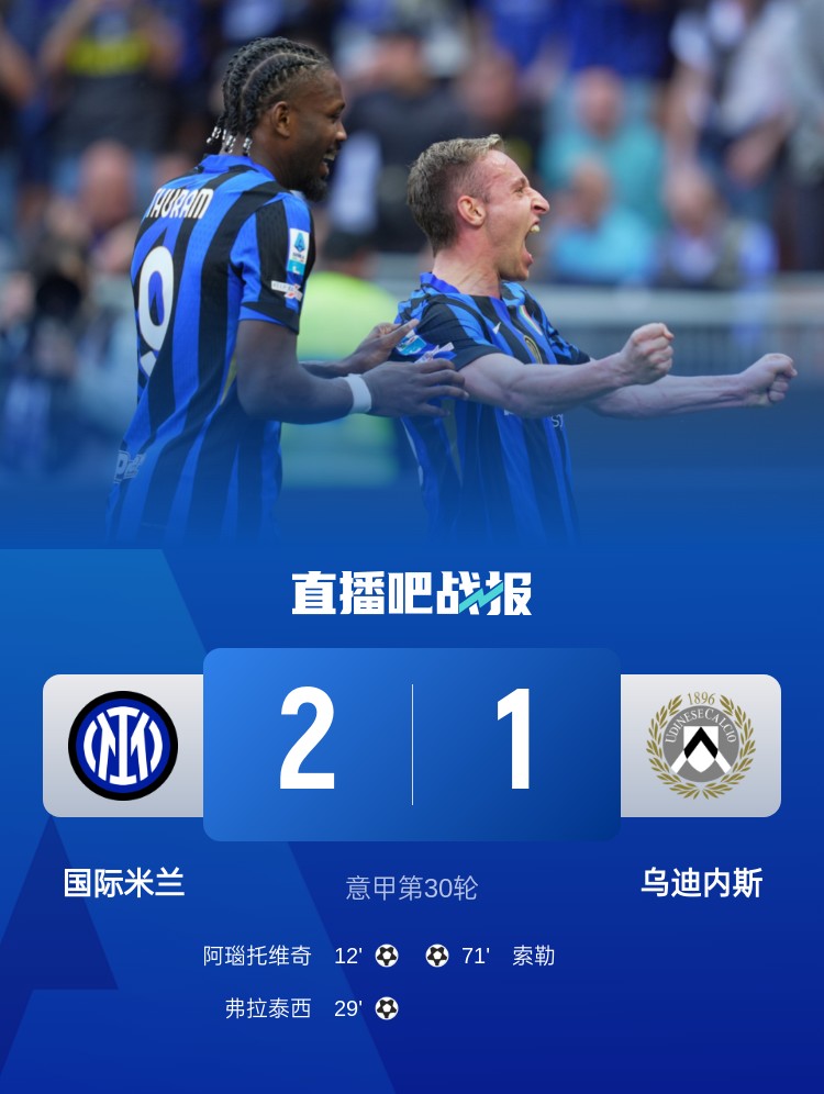 意甲第30輪,國(guó)際米蘭2-1烏迪內(nèi)斯,阿瑙托維奇、弗拉泰西破門,索默神撲。