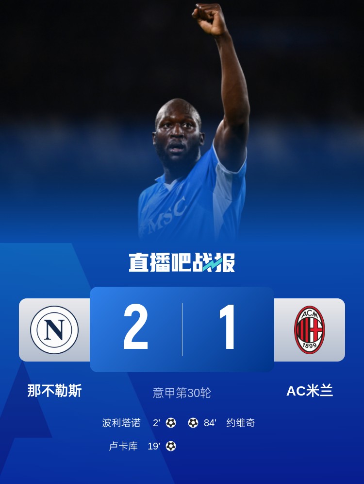 意甲第30輪,那不勒斯2-1AC米蘭,波利塔諾開場(chǎng)閃擊,盧卡庫破門。