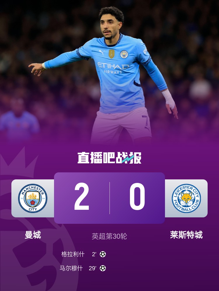 格拉利什閃擊破門,馬爾穆什擴大領先優(yōu)勢,曼城2-0擊敗萊斯特城。