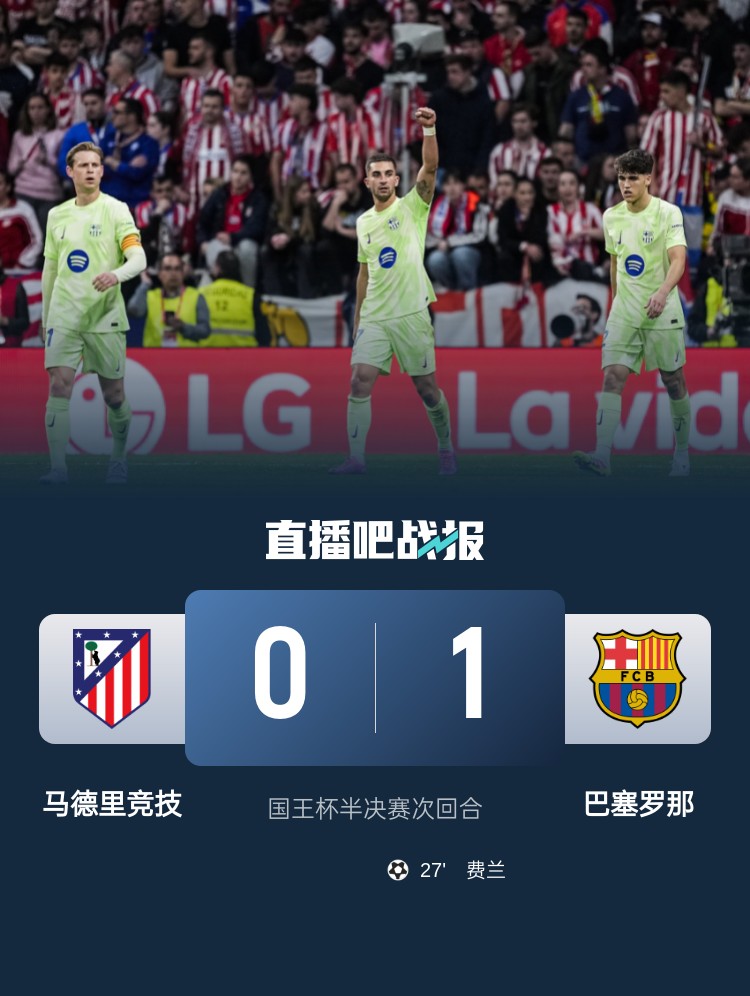 費蘭制勝,巴薩客場1-0戰(zhàn)勝馬競,總比分5-4淘汰馬競進軍國王杯決賽,將對陣皇馬。