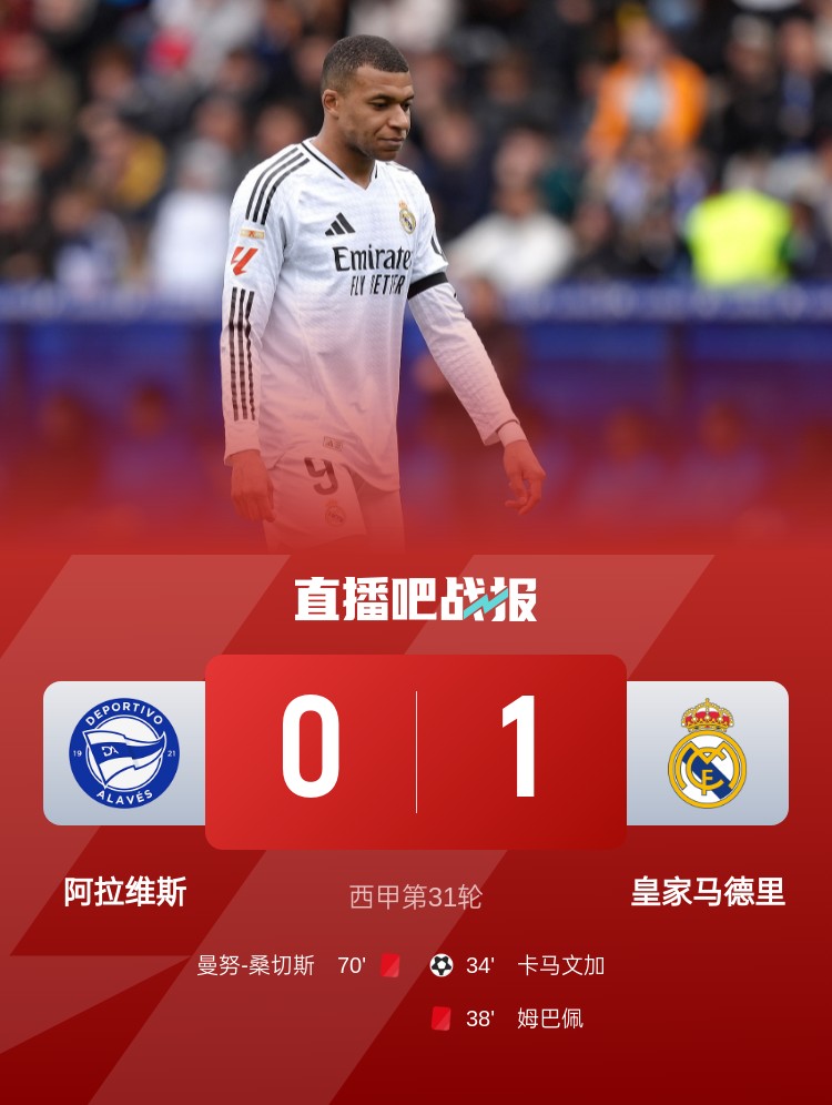 卡馬文加世界波迎聯(lián)賽首球,姆巴佩兇狠蹬踏對手小腿被直紅罰下,最終十人皇馬客場1-0戰(zhàn)勝十人阿拉維斯。