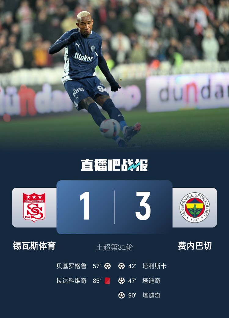 聯(lián)賽3連勝!費內(nèi)巴切3-1錫瓦斯體育 塔利斯卡任意球塔迪奇雙響
