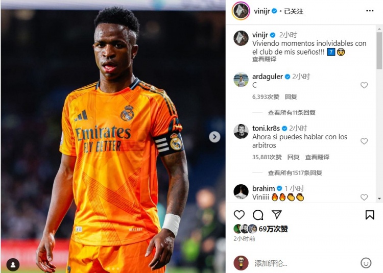 2025-02-27 16:05:26維尼修斯社媒發(fā)文慶祝勝利:與我夢(mèng)中的俱樂部一起經(jīng)歷難忘時(shí)刻