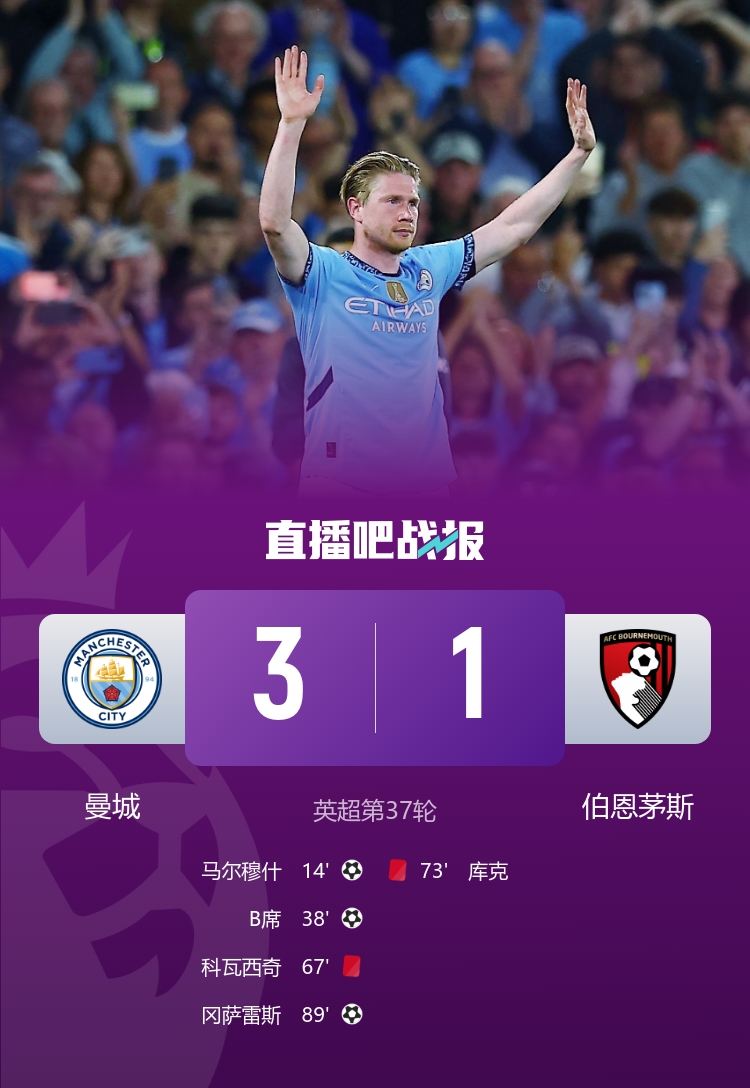 英超第37輪,曼城3-1伯恩茅斯。上半場(chǎng)馬,爾穆什世界波,德布勞內(nèi)空門擊中橫梁,京多安助攻B席再下一城;下半場(chǎng),科瓦西奇直紅,庫(kù)克也被直紅罰下,羅德里復(fù)出,尼科-岡薩雷斯個(gè)人英超首球,幫助球隊(duì)鎖定勝局。