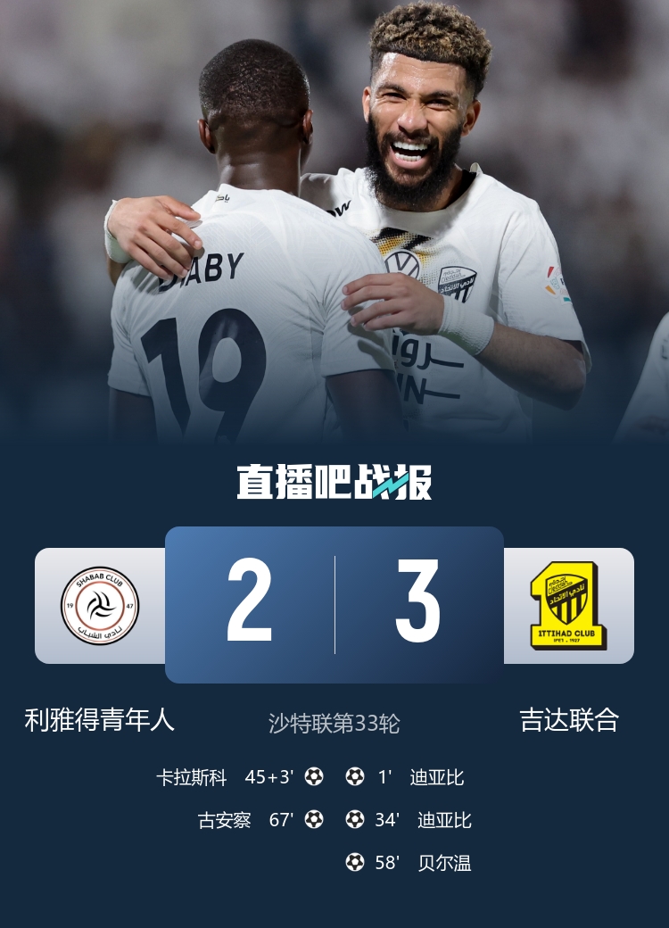 沙特聯(lián)第33輪,吉達(dá)聯(lián)合3-2利雅得青年人。上半場(chǎng),迪亞比開場(chǎng)30秒閃擊+梅開二度,卡拉斯科扳回一城;下半場(chǎng),坎特助攻,貝爾溫傳射,古安察再追一球。