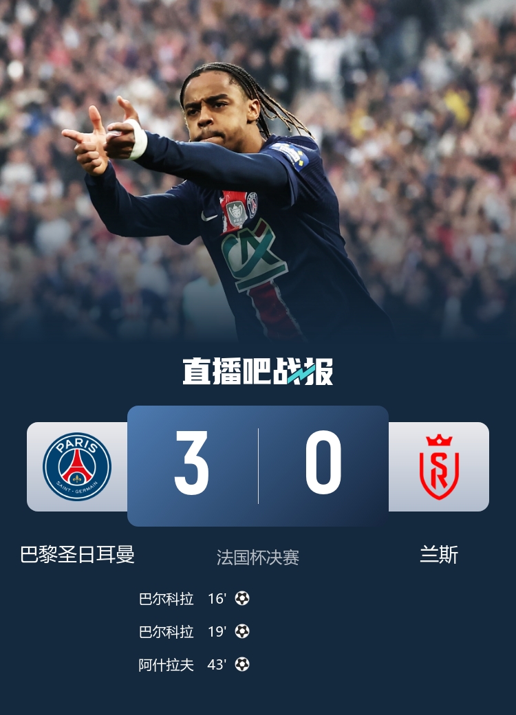 劍指歐冠!巴黎3-0蘭斯加冕法國杯&國內(nèi)奪3冠 巴爾科拉2射1傳