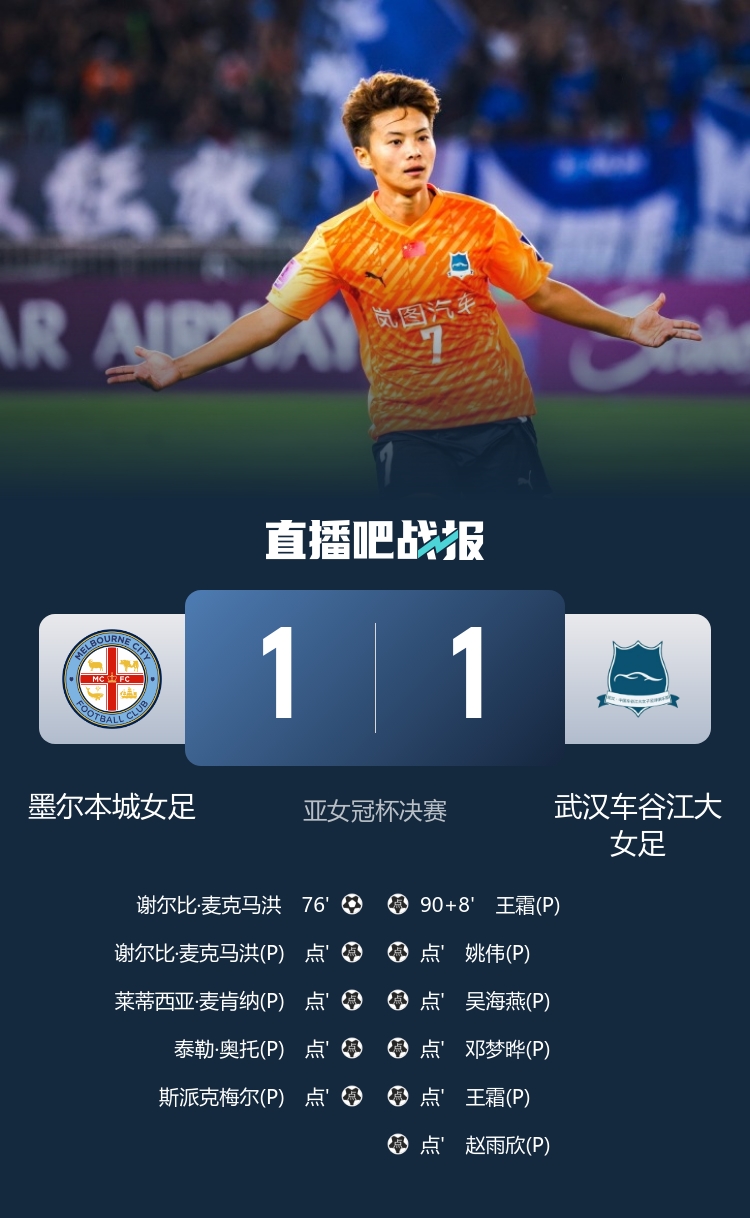 亞女冠杯決賽,武漢車谷江大女足點球大戰(zhàn)戰(zhàn)勝墨爾本城女足,奪得首屆女足亞冠冠軍。