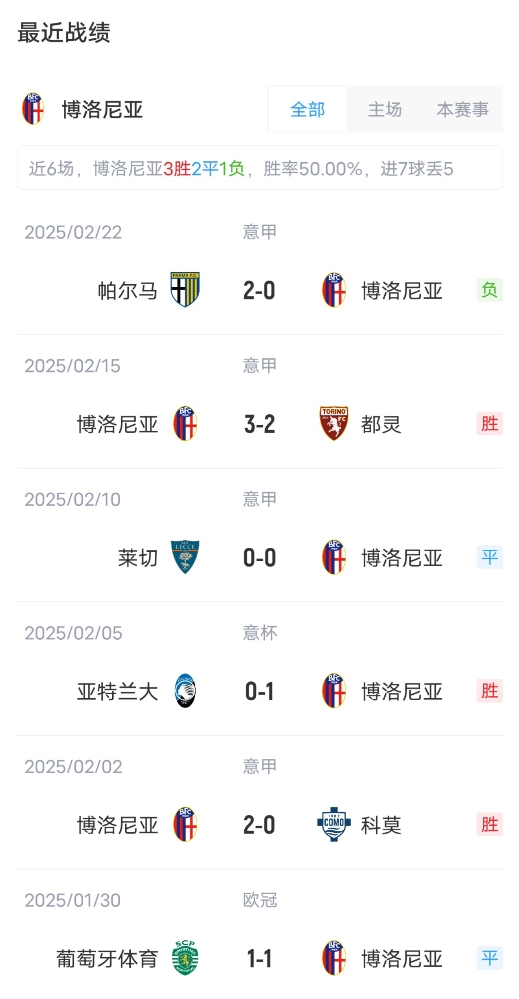 目前意甲25輪比賽過后,AC米蘭11勝8平6負(fù)積41分,位列意甲第7位。博洛尼亞10勝11平4負(fù)積41分,位列第8。