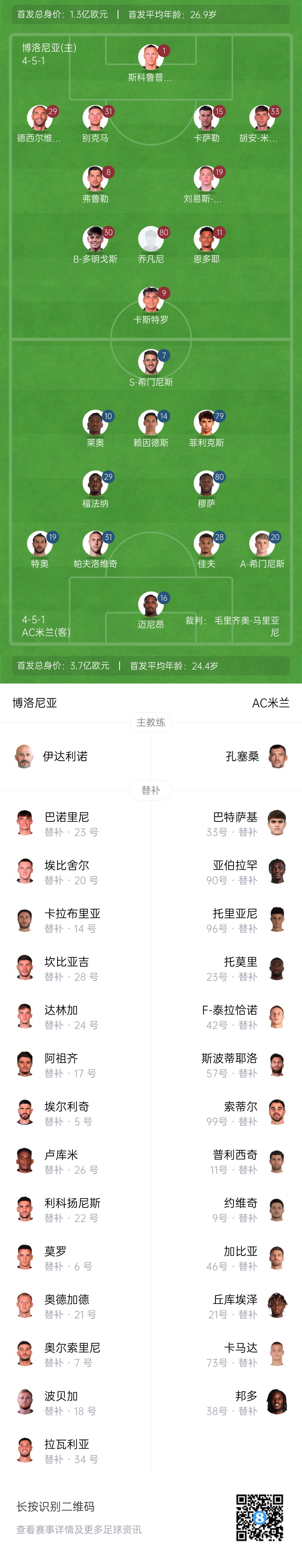 博洛尼亞替補(bǔ):23-巴諾里尼、34-拉瓦利亞、5-埃爾利奇、14-伊令、22-利科揚(yáng)尼斯、26-盧庫米、6-莫羅、17-阿祖齊、18-波貝加、20-埃比舍爾、7-奧爾索里尼、21-奧德加德、24-達(dá)林加、28-坎比亞吉