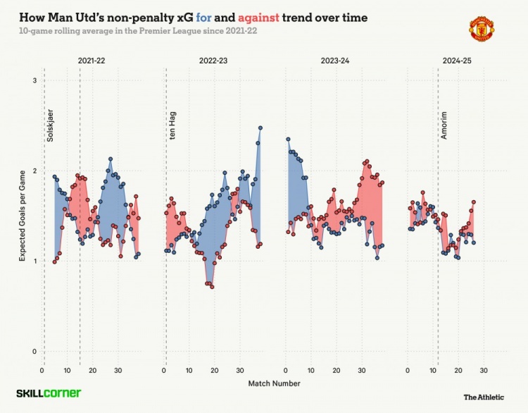 至于防守端,阿莫林的到來并沒有帶來什么明顯的改變——曼聯(lián)的防守?cái)?shù)據(jù)并沒有因?yàn)榘⒛值牡絹恚玫矫黠@提升。