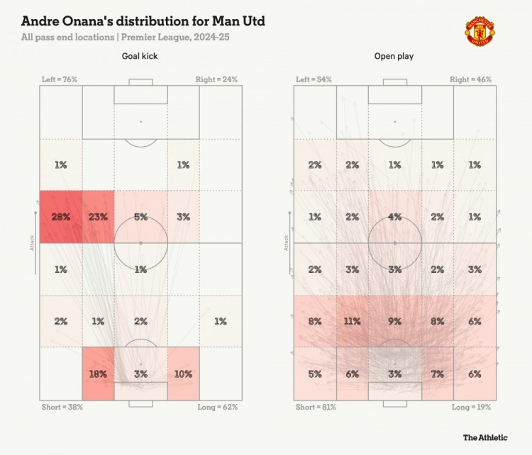 問題似乎在進(jìn)攻組織的早期階段就已經(jīng)出現(xiàn),從奧納納開始就是如此。曼聯(lián)似乎還沒有找到他最適合的出球方式——盡管現(xiàn)在有點(diǎn)兒趨勢(shì)了。本賽季,無論是在滕哈赫,還是在阿莫林麾下,奧納納經(jīng)常會(huì)采用長(zhǎng)傳球的方式出球,如下圖所示。