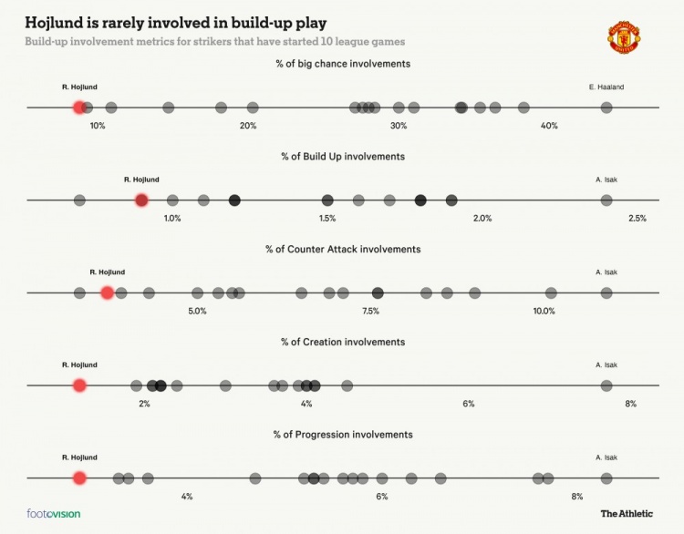 來自Footovision的數(shù)據(jù),進(jìn)一步突顯了霍伊倫在比賽中缺乏參與度。本賽季到目前為止,比賽首發(fā)過半數(shù)的英超前鋒中,霍伊倫的進(jìn)攻組織參與度只有1.3%,這突顯了他在進(jìn)攻組織階段幾乎是可有可無。