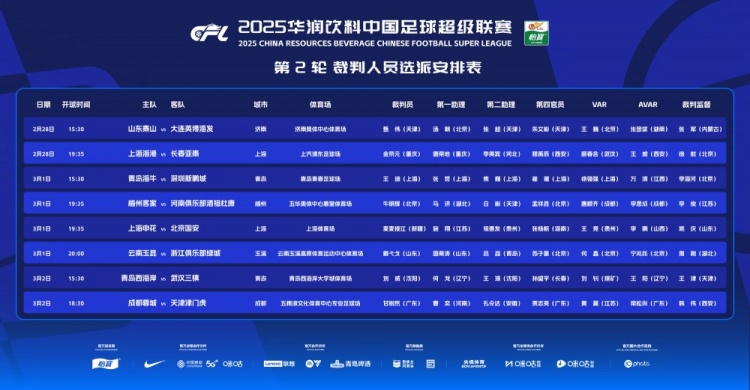 2025-02-28 16:05:32中超第2輪裁判安排:麥麥提江吹罰申花vs國(guó)安,VAR王競(jìng),無李海新
