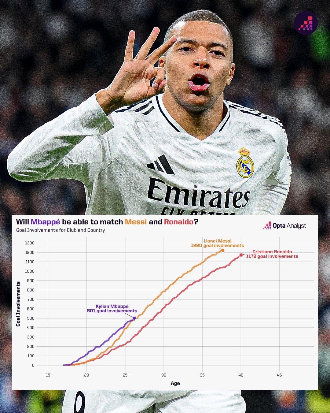 2025-02-21 17:40:36梅羅均破千!姆巴佩生涯直接參與501球 與同年齡梅西相當(dāng)&高于C羅