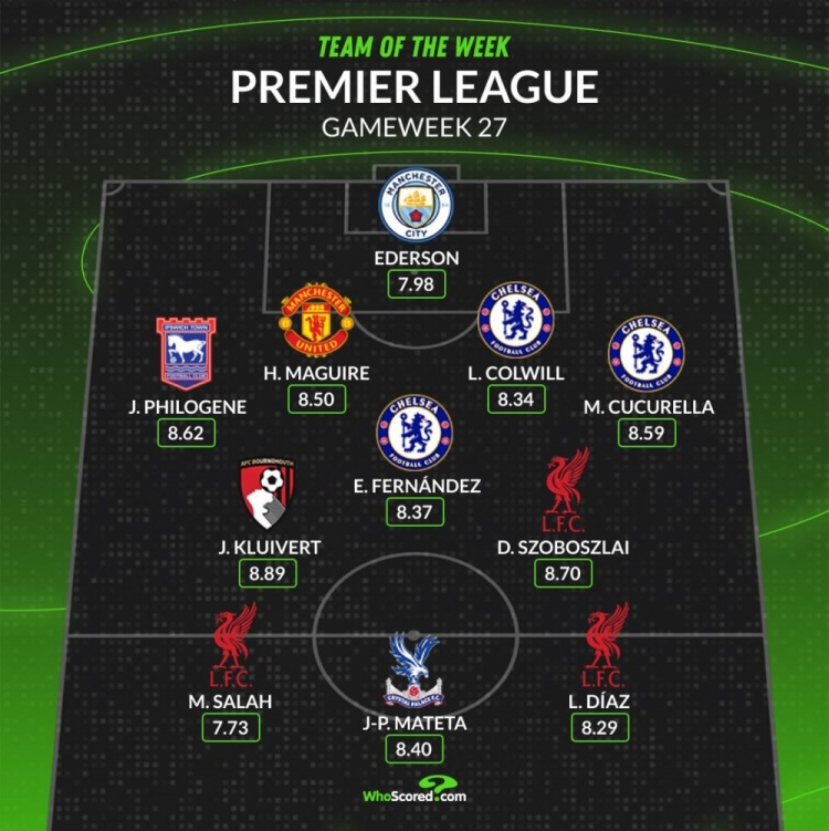2025-03-01 08:04:59whoscored本輪英超最佳陣:恩佐&索博領銜,埃德森&馬奎爾在列