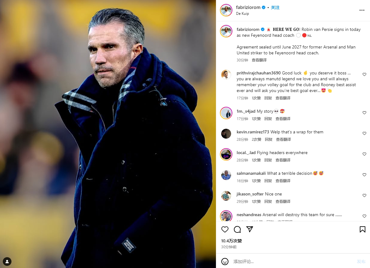 2025-02-21 17:41:27Here we go!羅馬諾:41歲范佩西出任費耶諾德主帥,簽約至2027