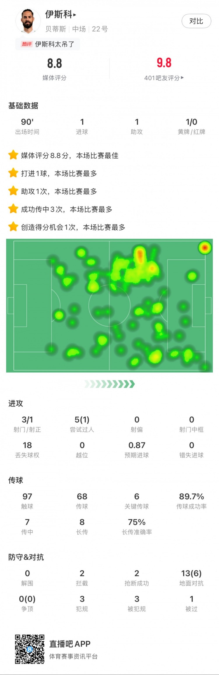 2025-03-02 08:31:44伊斯科本場(chǎng)數(shù)據(jù):1球1助,6次關(guān)鍵傳球,獲評(píng)8.8分全場(chǎng)最高