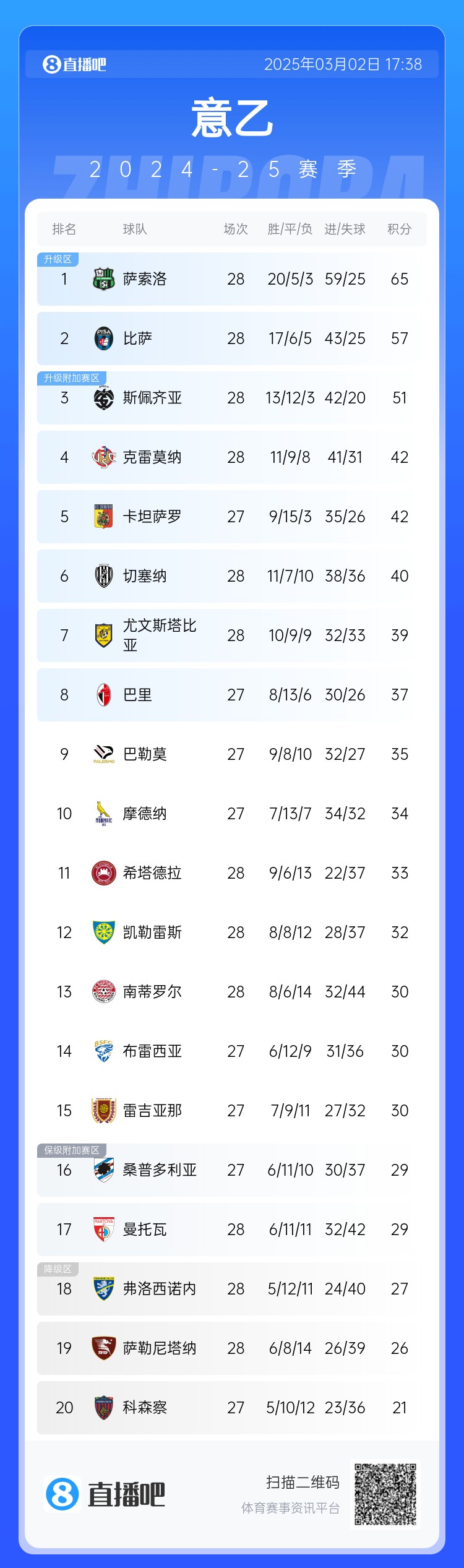 2025-03-02 18:06:15薩索洛要回來了——本輪意乙1-0擊敗第二比薩,領先第三14分
