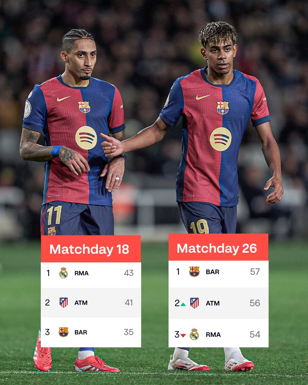 2025-03-03 17:27:59扭轉(zhuǎn)局勢!ESPN曬照:18輪后巴薩落后皇馬8分,第26輪后巴薩領(lǐng)跑