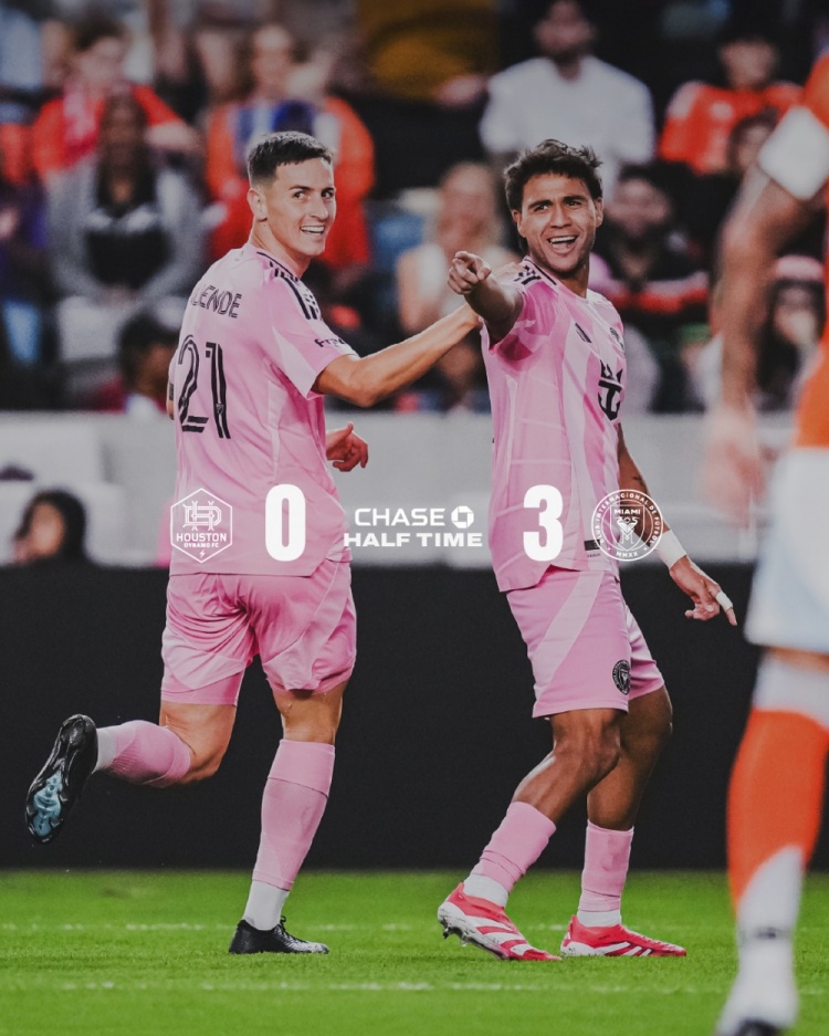 上半場比賽結束,邁阿密國際3-0休斯頓迪納摩。