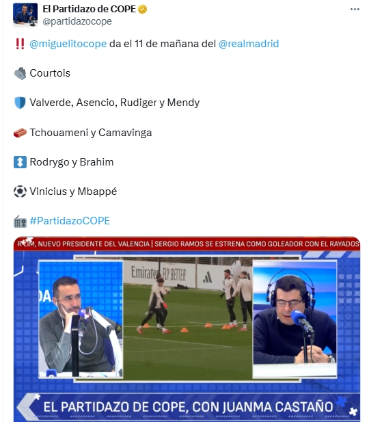 科貝電臺(tái)透露皇馬首發(fā):庫(kù)爾圖瓦、巴爾韋德、勞爾-阿森西奧、呂迪格、門(mén)迪、瓊阿梅尼、卡馬文加、羅德里戈、迪亞斯、維尼修斯、姆巴佩