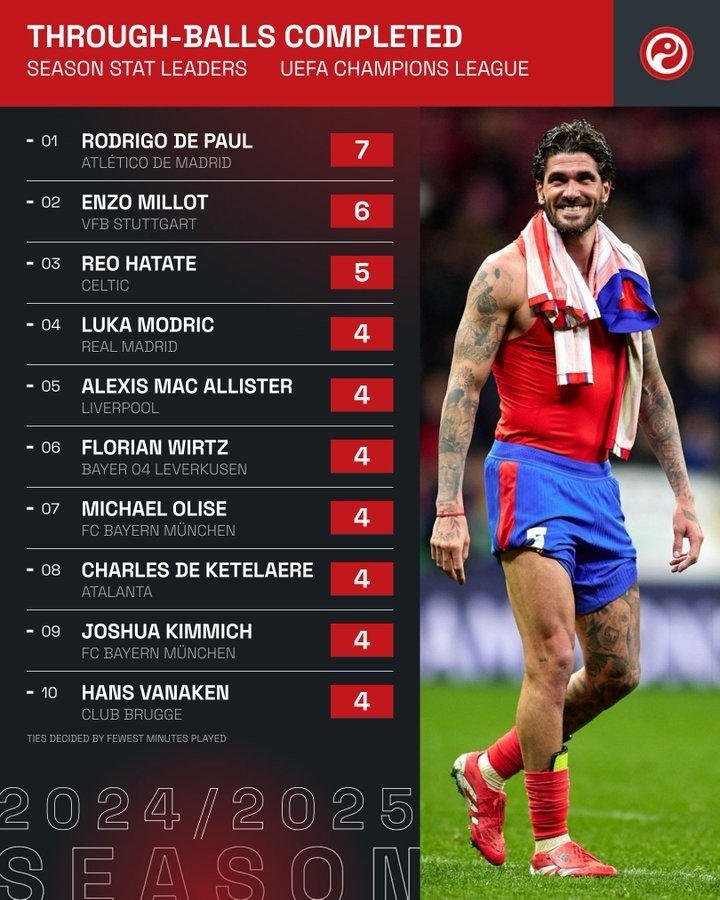 2025-03-04 09:06:08本賽季歐冠精準(zhǔn)直塞榜:德保羅居首,魔笛、麥卡、維爾茨在列