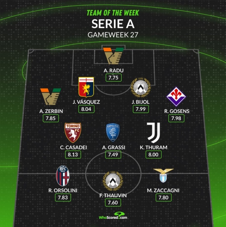 2025-03-04 20:29:03whoscored意甲本周最佳陣:K-圖拉姆&拉杜領(lǐng)銜 卡薩迪&戈森斯在列