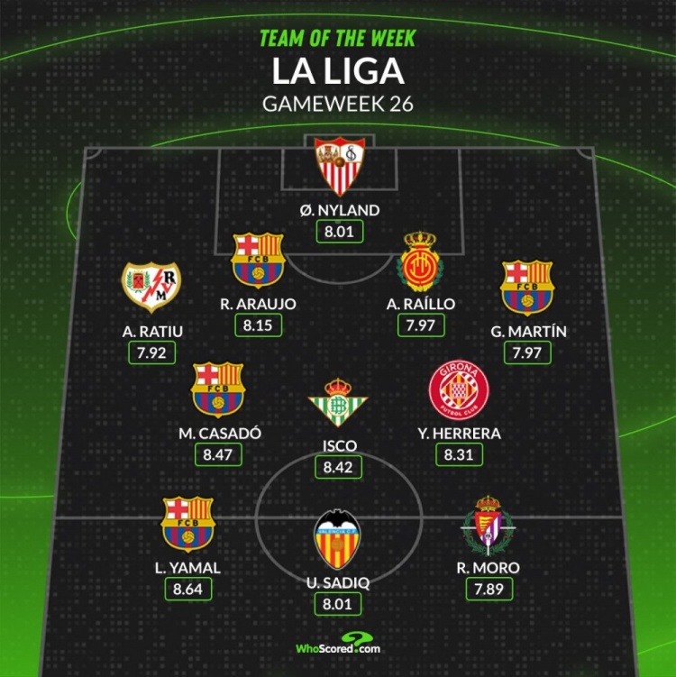 2025-03-04 20:29:11WhoScored評西甲第二十六周最佳陣:巴薩四名球員入選