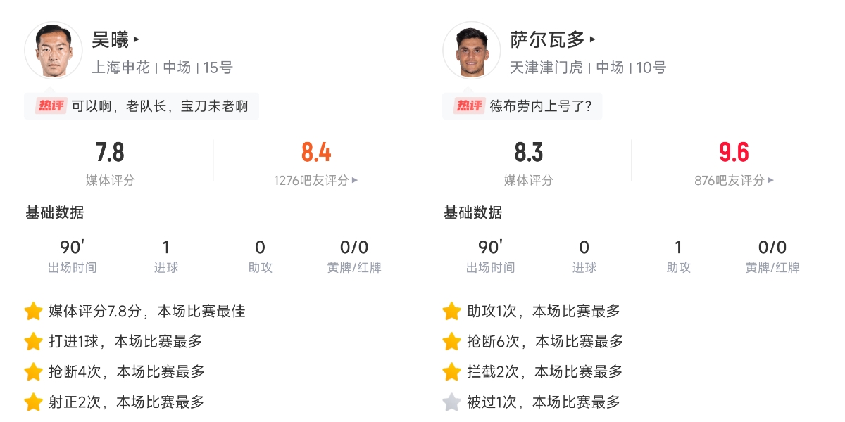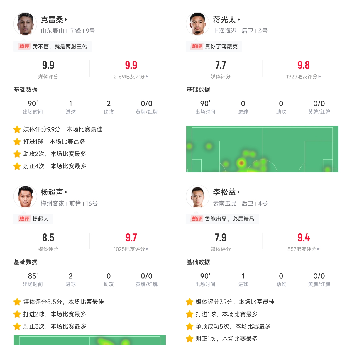 2025-03-04 20:35:55【直播吧】中超第二輪最佳球員:克雷桑毫無懸念當選,評分9.9!