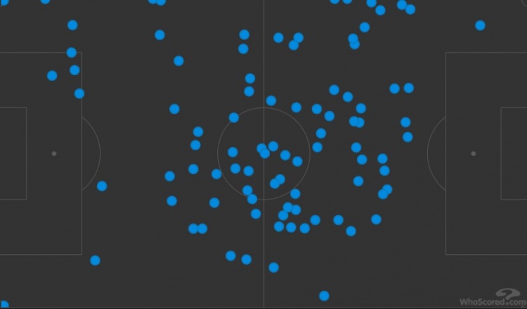 中場(chǎng)的傳球散點(diǎn)圖:幾乎沒有幾次好的向前機(jī)會(huì)