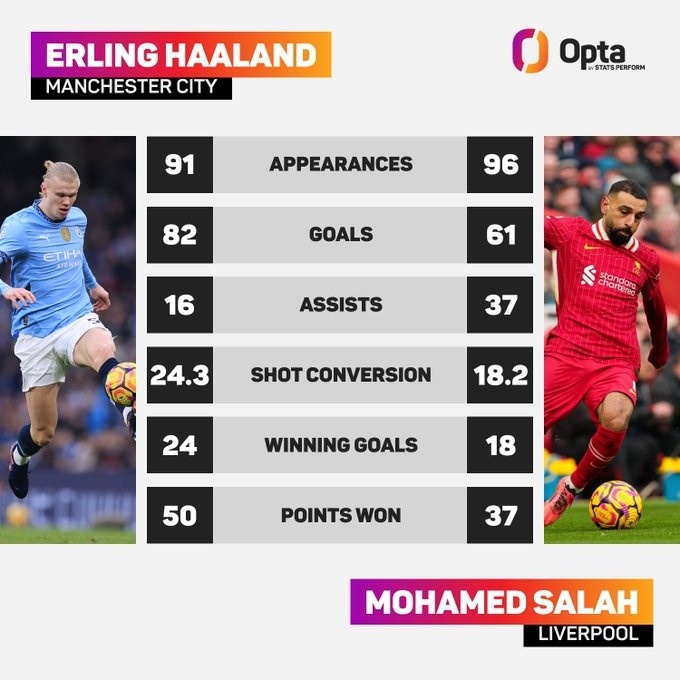 2025-02-21 17:45:32近3賽季哈蘭德vs薩拉赫英超數(shù)據(jù)對(duì)比:都參與98球,哈蘭德場(chǎng)次少