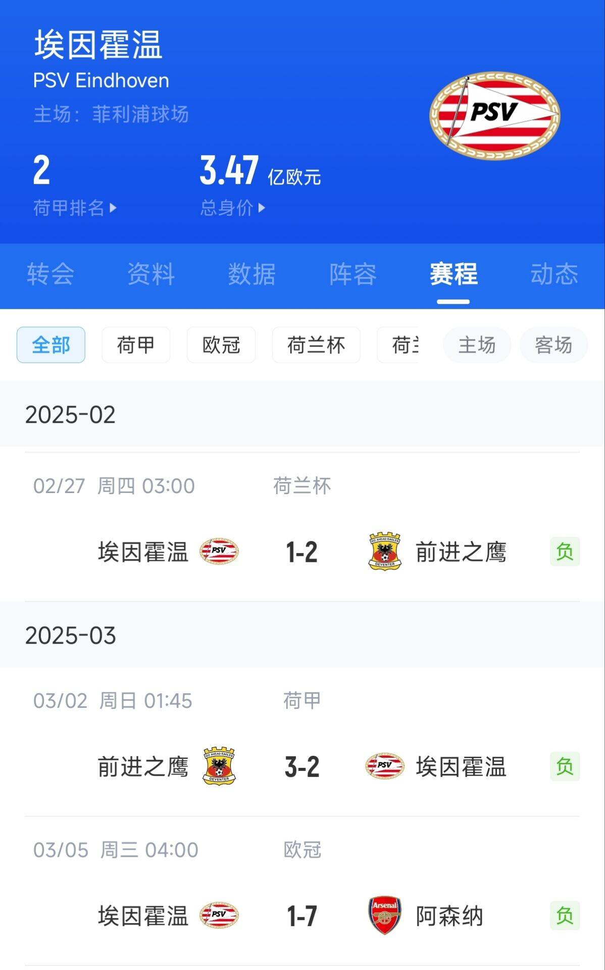 2025-03-05 11:08:24噩夢(mèng)席卷而來!埃因霍溫一周內(nèi)荷杯出局&荷甲8分落后,歐冠被爆捶