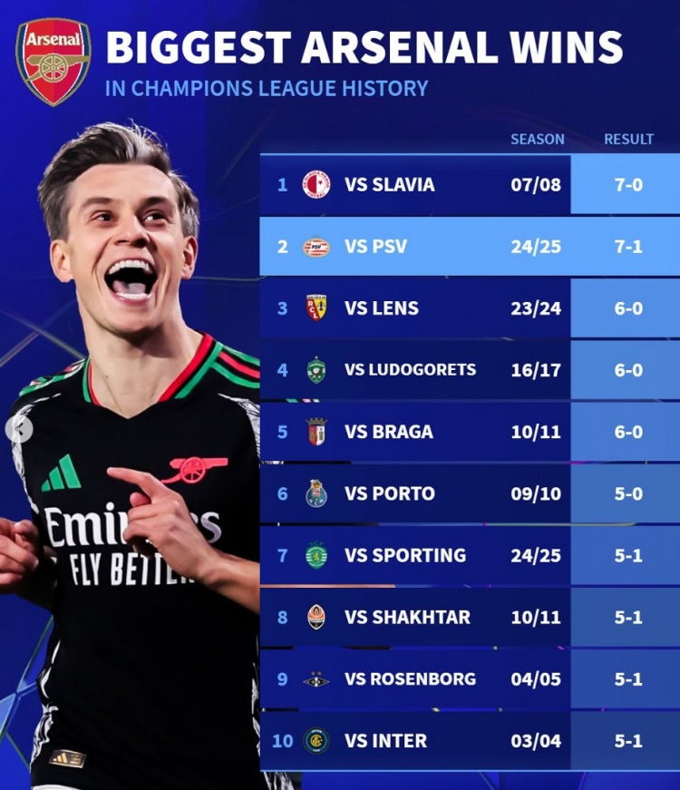 2025-03-05 20:18:52德轉列阿森納隊史歐冠大勝榜:7-0布拉格斯拉維亞、5-1國米