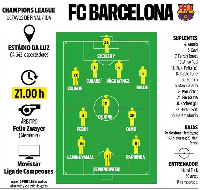 3月5日訊 巴薩將在今晚的歐冠1/8決賽首回合客場對陣本菲卡,《每日體育報》則對巴薩首發(fā)進行了預測,其中中場三人組將是奧爾莫、德容和佩德里。