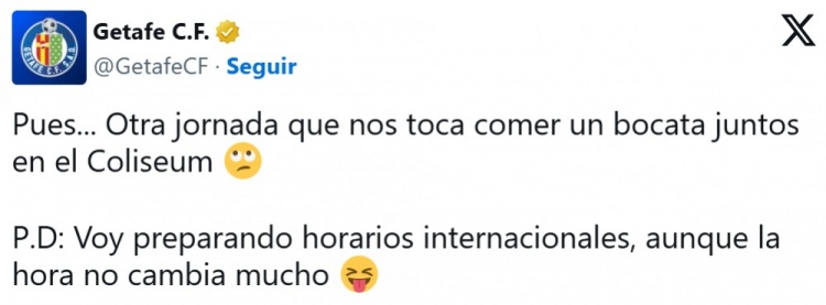 赫塔菲將于本周日下午14:00對陣馬競,而他們下個主場對陣萊加內斯的比賽也是在下午14:00進行。與此同時,西甲聯(lián)賽宣布了第29輪的賽程,赫塔菲再次在下午14:00主場迎戰(zhàn)比利亞雷亞爾,俱樂部在社交網絡上調侃這一賽程。