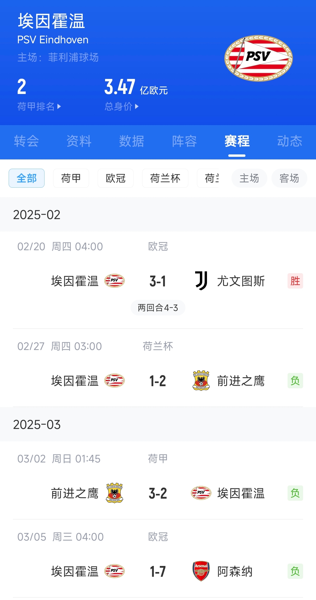 03月05日訊 歐冠16強比賽首回合,埃因霍溫在主場1-7被阿森納擊敗。在歐冠附加賽3-1逆轉(zhuǎn)尤文之后,埃因霍溫各項賽事3連敗。另一場布魯日則是主場1-3不敵維拉,雙殺亞特蘭大后1平2負1勝難求。