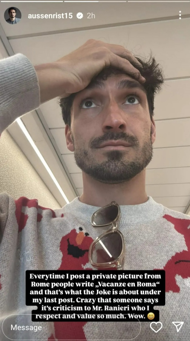 隨后,胡梅爾斯更新社媒進行澄清。他曬出自己表情無奈的自拍,并寫道:每當(dāng)我發(fā)布在羅馬的私人照片時,人們都會寫‘羅馬假日’,這就是我上一篇帖子下面鬧出的笑話。 有人說那是對拉涅利先生的批評,這太瘋狂了,我非常敬重他。哇。????