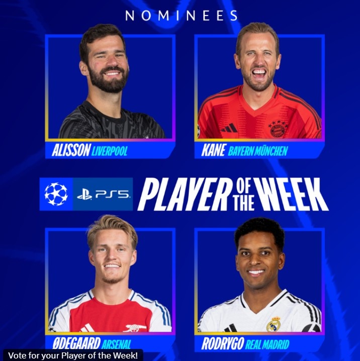 2025-03-06 10:30:19歐冠官方本輪最佳球員候選:阿利森、凱恩、羅德里戈、厄德高