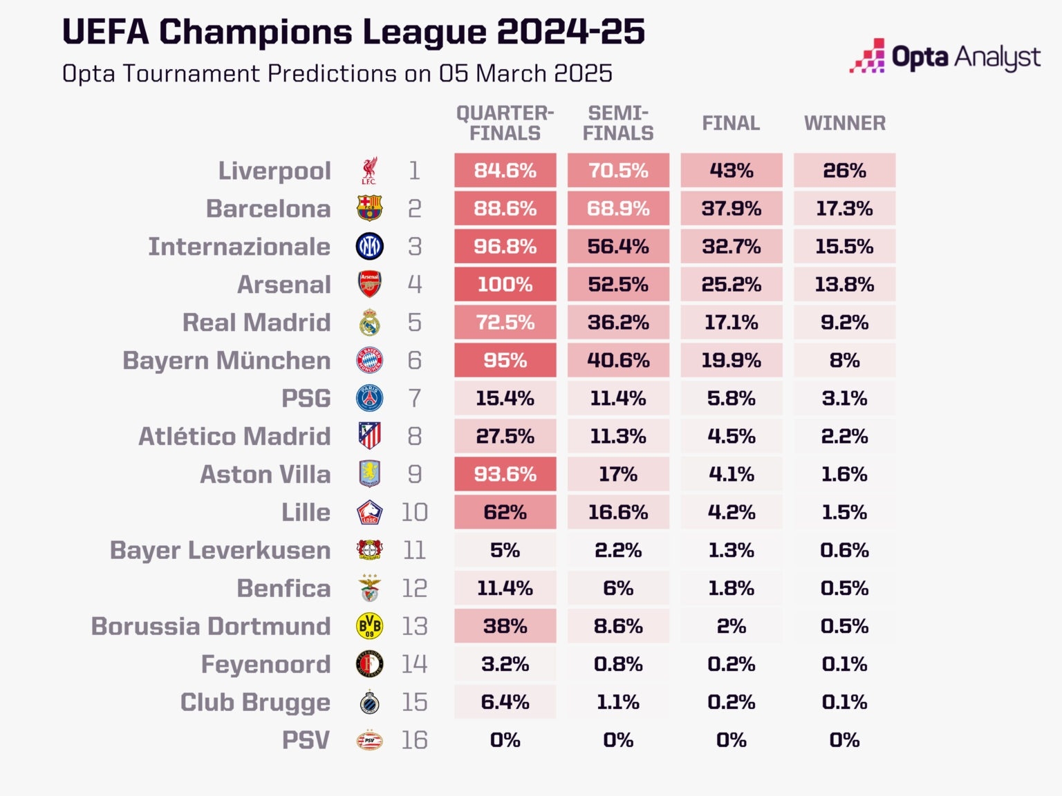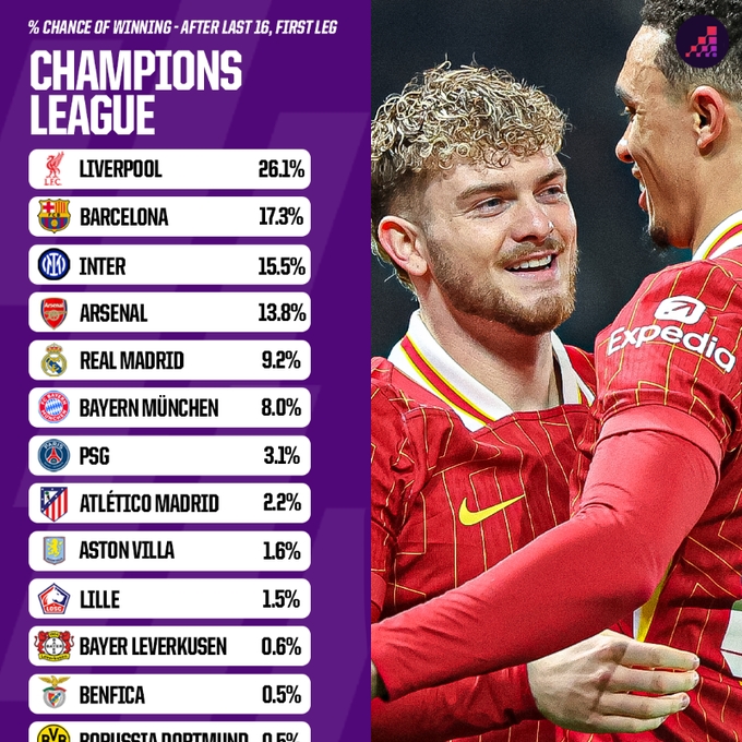 2025-03-06 10:31:16Opta歐冠晉級概率:利物浦、巴薩有望會師決賽 國米、槍手劍指4強