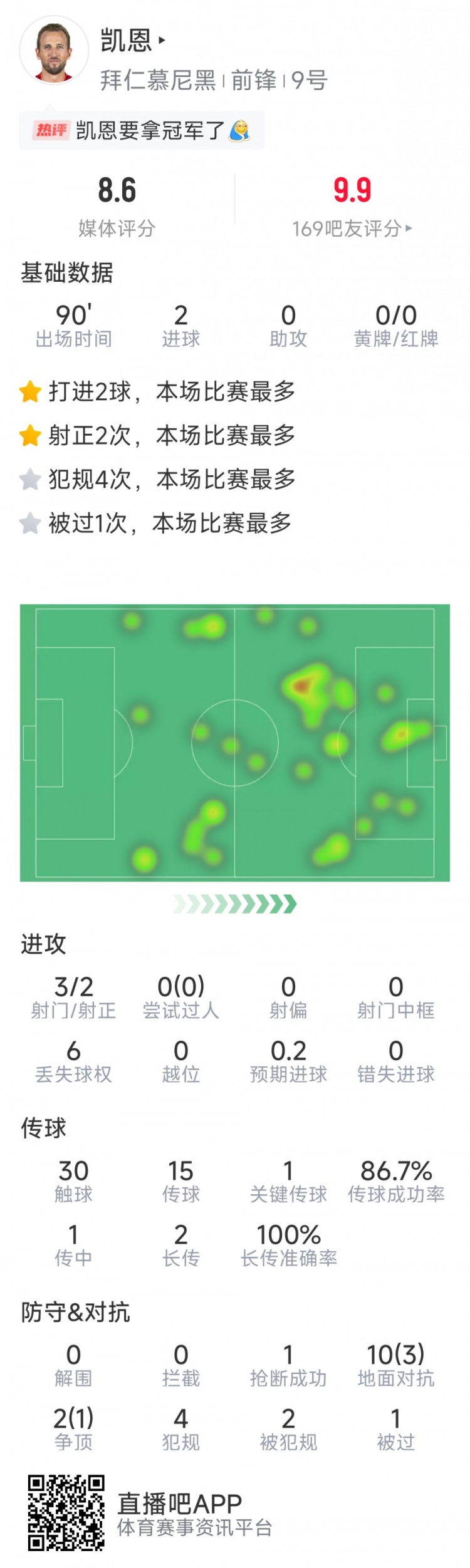 2025-03-06 10:34:41凱恩本場(chǎng)數(shù)據(jù):梅開(kāi)二度,3射2正,1次關(guān)鍵傳球,評(píng)分8.6分