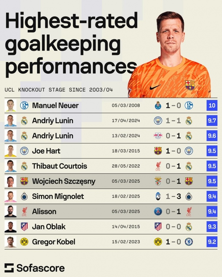 sofascore歐冠淘汰賽歷史門將評(píng)分榜:03-04賽季以來(lái)有統(tǒng)計(jì)