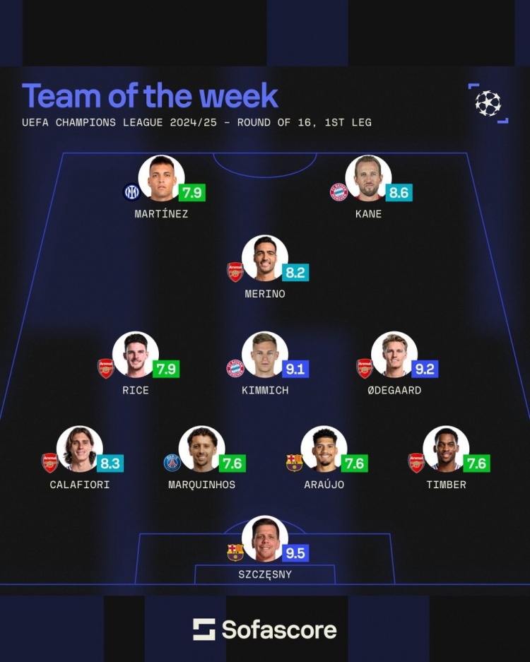 2025-03-07 03:08:03sofascore本輪歐冠最佳陣:厄德高領(lǐng)銜槍手5將,基米希、3C在列