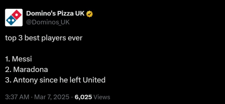 2025-03-07 12:58:20達(dá)美樂(lè)披薩吹圓神:歷史前三是梅西、馬拉多納、離開(kāi)曼聯(lián)的安東尼