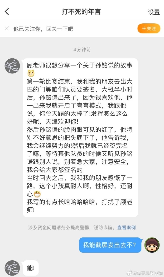 3月7日訊 今天,天津記者顧穎在社媒分享了一名球迷與津門(mén)虎球員孫銘謙之間的小故事。